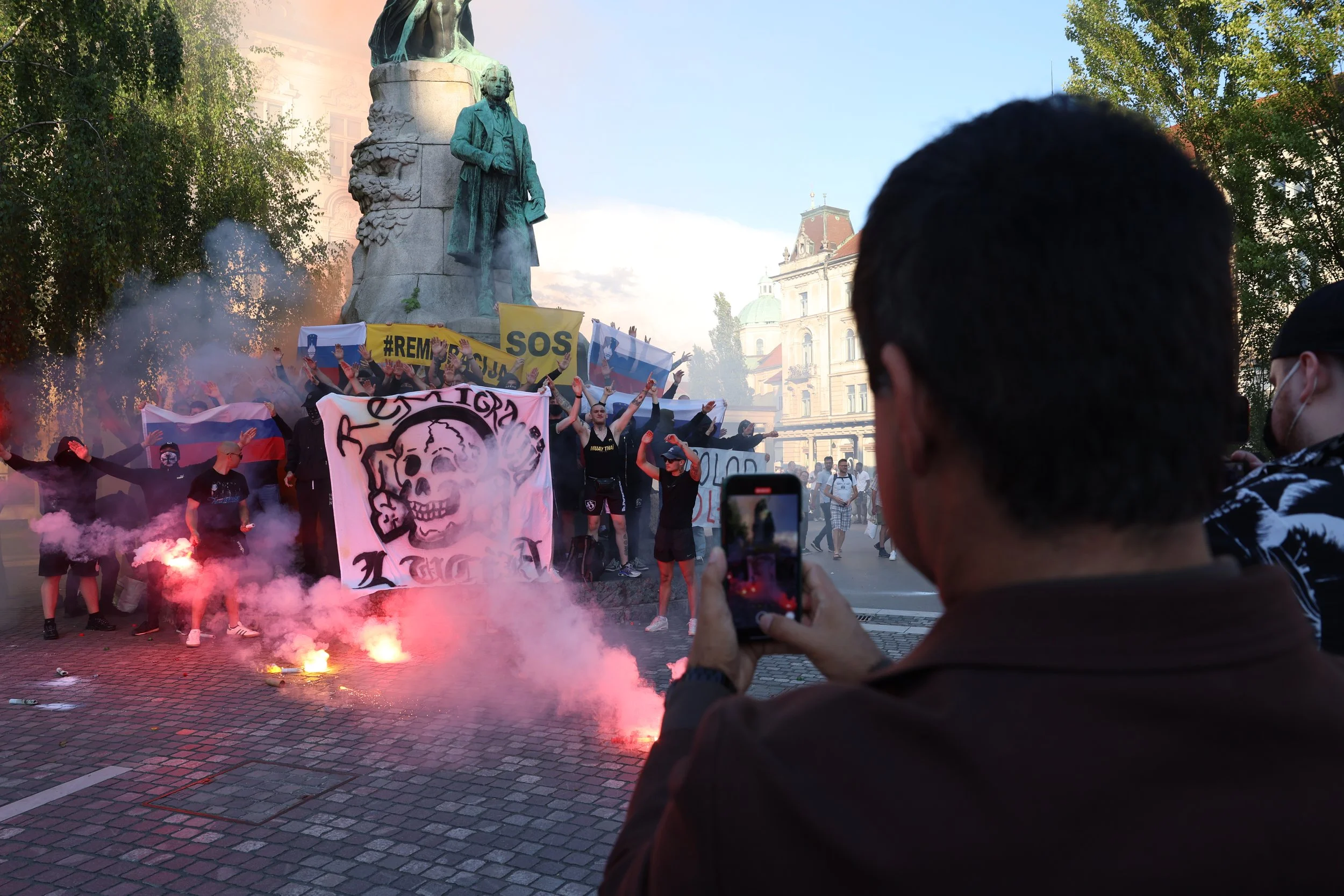 Na Prešernovem trgu so razvili velik transparent, ki je imel na vrhu napis remigracija, v središču pa je bila narisana lobanja. Gre za neonacistični simbol, znan kot Totenkopf. Udeleženca, ki sta bila na shodu v ospredju, pa sta imela vidne tetovaže kljukastega in keltskega križa.